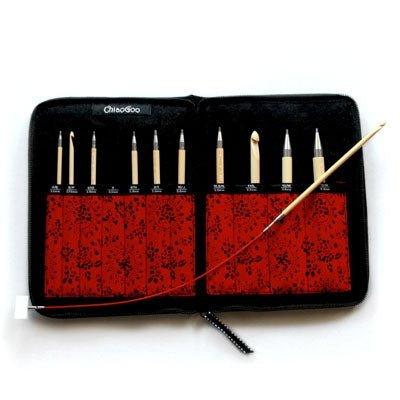 T-SPIN Bamboo Tunisian interchangeable set comes with the following: 11 5.7" (14.5cm) hooks in sizes E/4 (3.5mm) – N/15 (10mm), including size 7 (4.5mm); 4 TWIST [S] red cables (two 8"/20cm, one 14"/35cm and one 22"/55cm); 4 end stoppers, 4 adapters, 2 connectors, tightening keys and a needle gauge; zippered case very similar in design to the current interchangeable cases. The hooks are made of Moso bamboo, have a pointy head to get into your stitches and a stainless steel join. The size is permanently laser marked on each hook. Size I (5.5 mm) and larger hooks will fit the [S] cables with the use of an adapter (included). Compatible with SPIN cables.