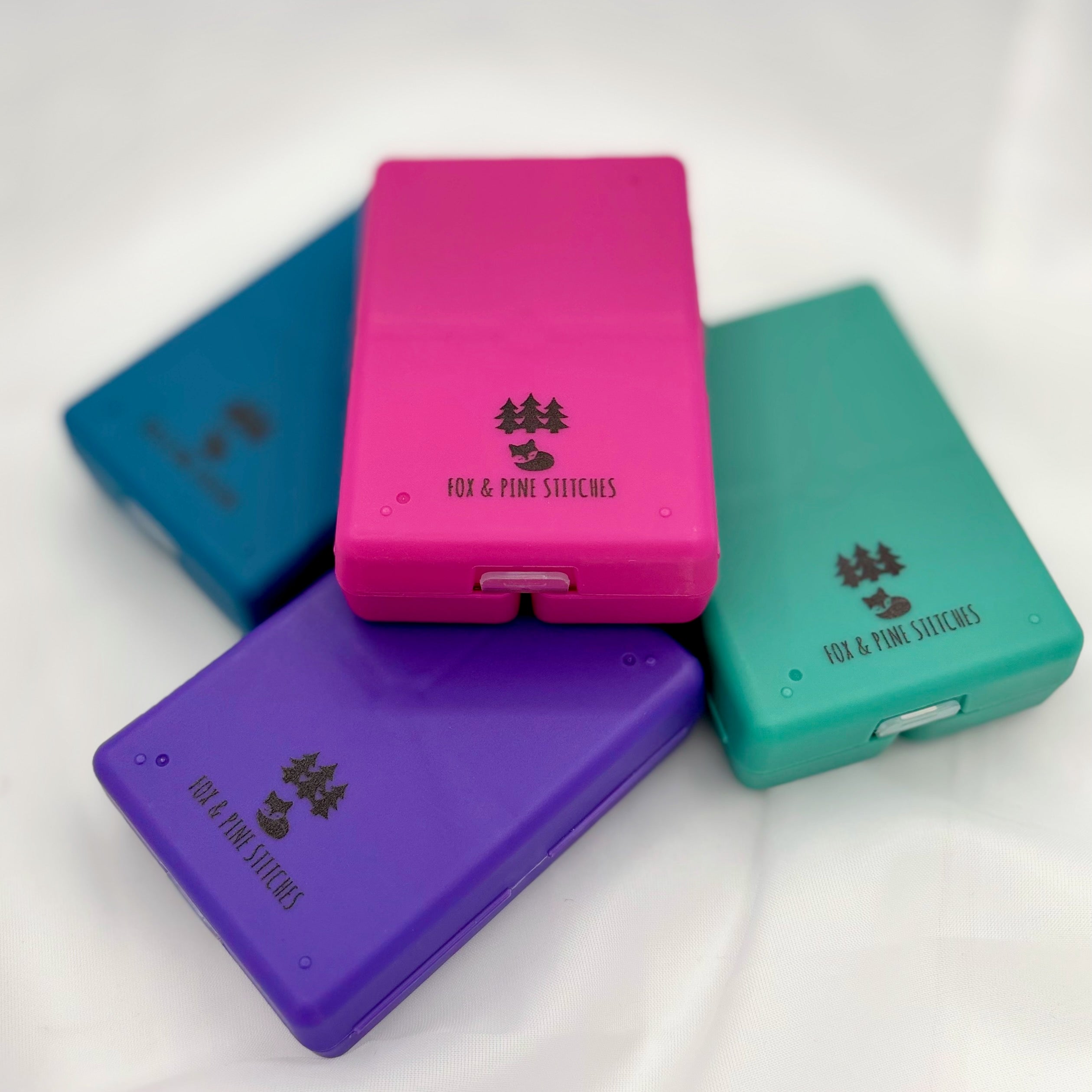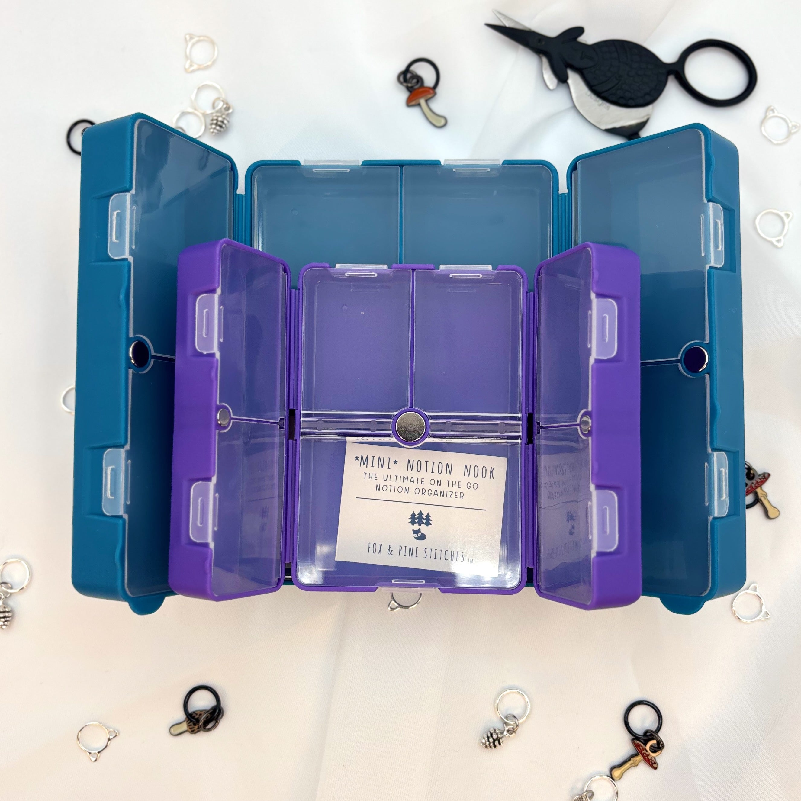 The ultimate on-the-go notion organizer. The high quality cases have transparent flaps for each compartment so you can see your collection of notions while keeping them organized in separate sections. The cases close securely with a strong magnet.