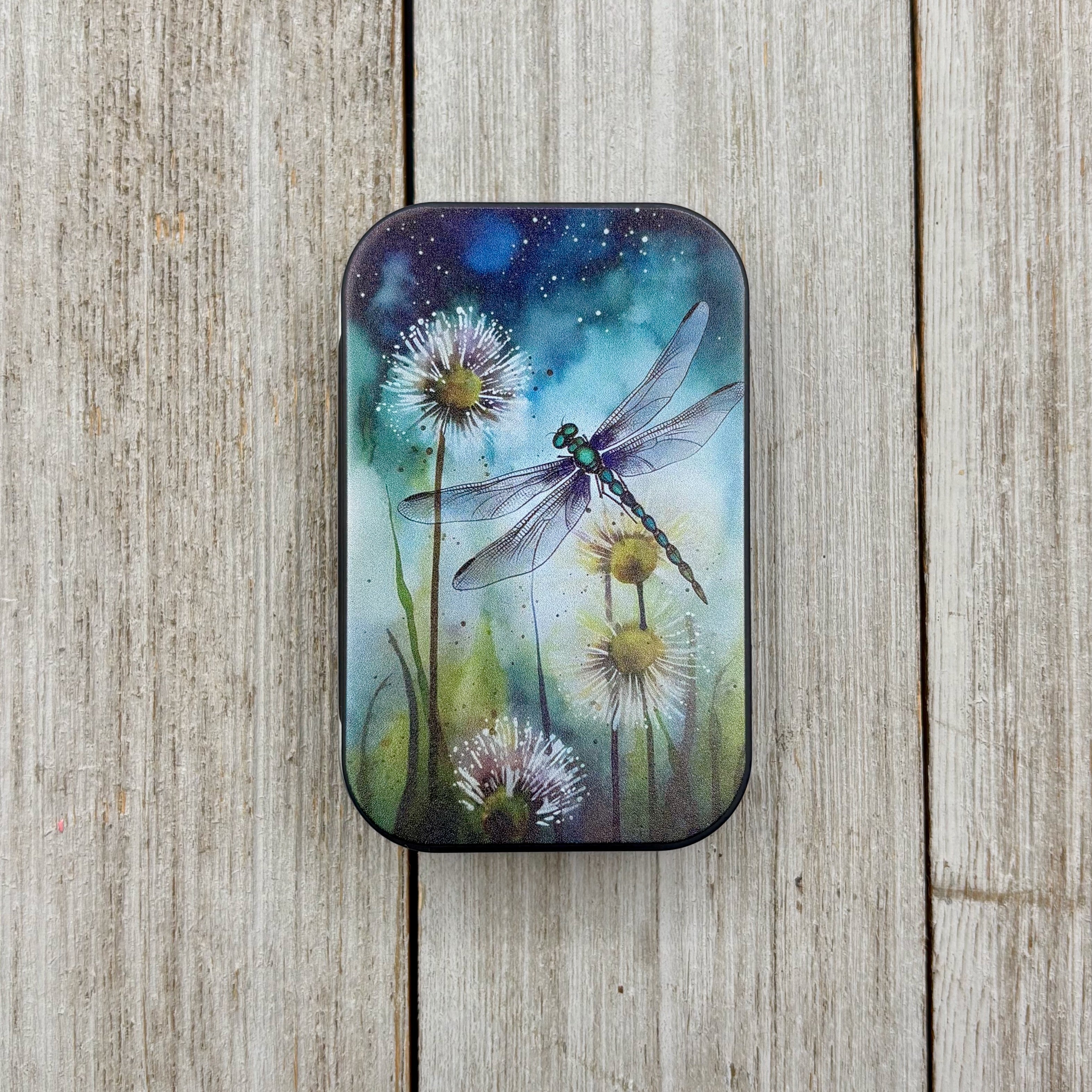 Compact metal tin designed for organizing essential notions and supplies. This durable storage solution keeps buttons, thread, needles, and small knitting or crochet accessories neatly contained and easily accessible.